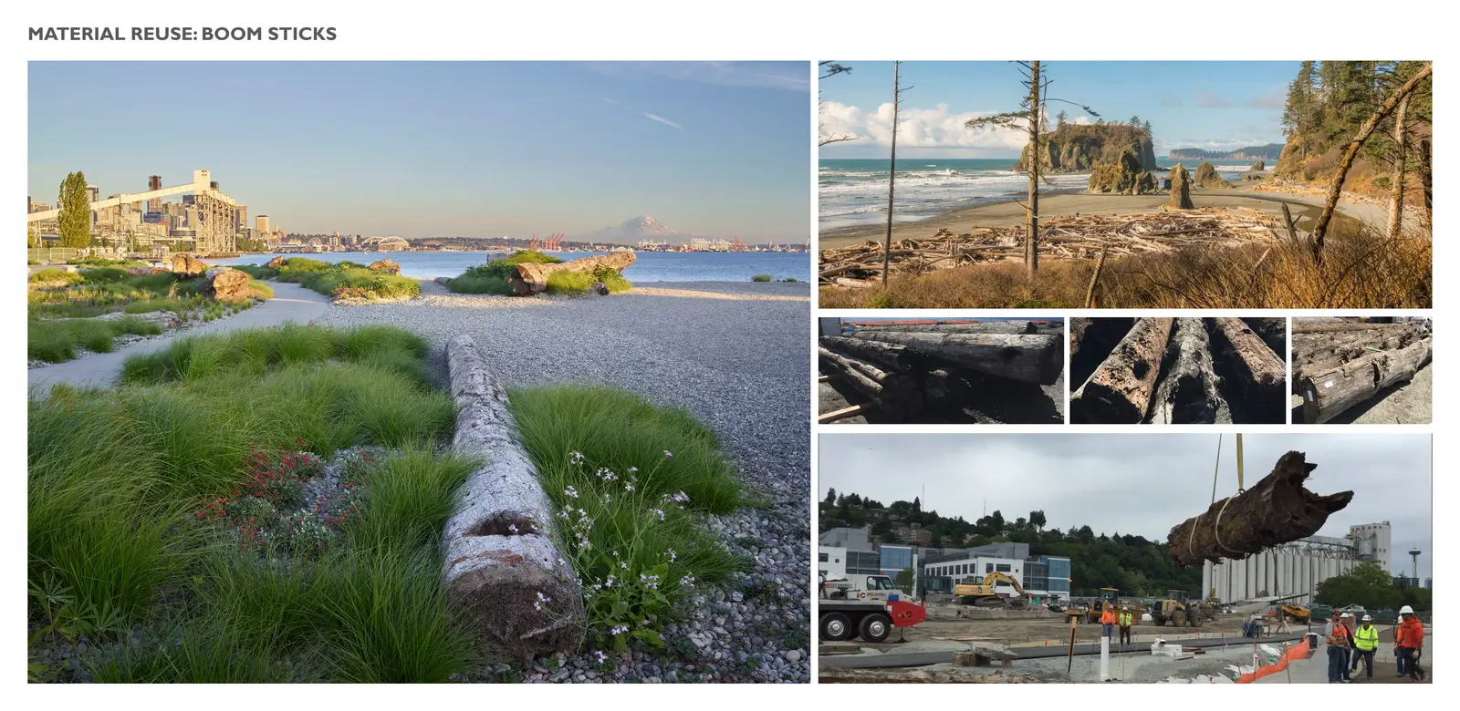 Material reclamation and adaptive reuse were core principles of the design process. The existing site had a series of formal landscape spaces that featured stone paving and monolithic stone elements. The reclaimed stone was stockpiled and reimagined for the new campus, including informal stone groupings nestled into the dune planting on the Beach. Inspired by the driftwood that washes onto the shores of Washington beaches, knotty spruce “boom sticks” from a decommissioned timber operation in Port Angeles were brought to the site and nestled into the planting and gravel dunes. The reclaimed stone boulders and driftwood break up the planting while also functioning as informal seating and play areas.