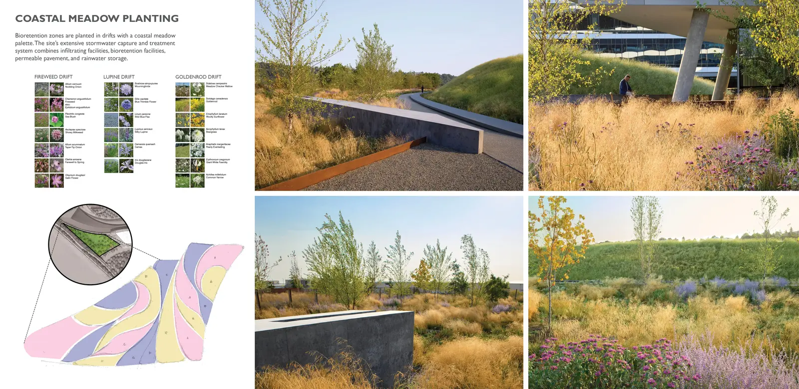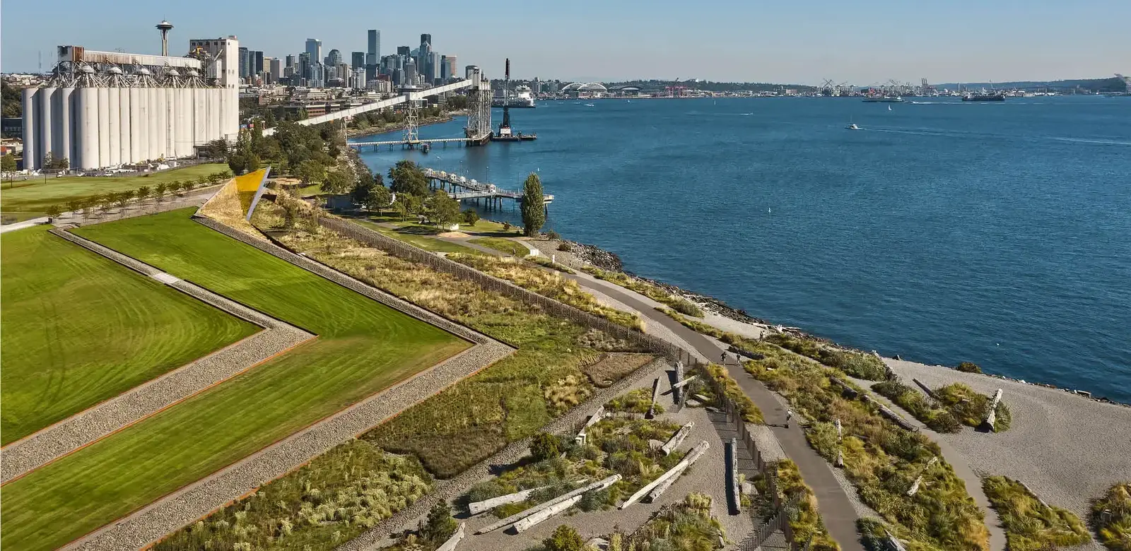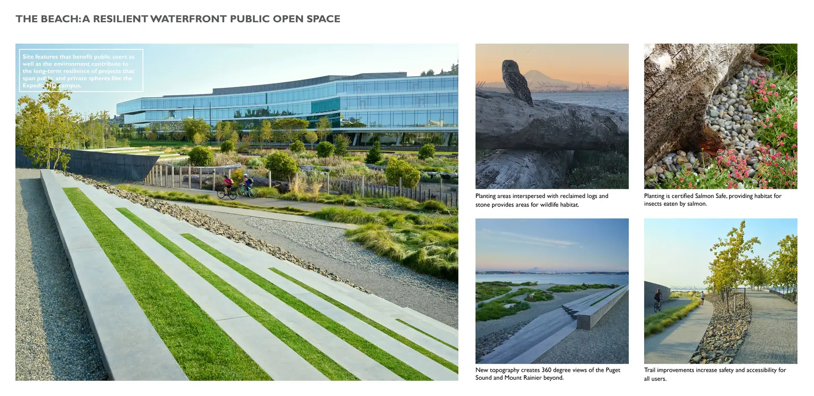Coastal parks and nearshore restoration are key in Washington State, requiring holistic, forward-thinking design strategies. Addressing ecological degradation, sea level rise, and stormwater runoff, the design team for The Beach at Elliott Bay restored a publicly accessible, 40-acre waterfront site and corporate campus north of downtown Seattle. Soil remediation and stormwater management revitalize the site, creating an equitable, active landscape rooted in social and ecological resilience offering new bike paths and a multi-use trail system. With views of Puget Sound and Mount Rainier, the project demonstrates a systems-based approach to sustainability, prioritizing social, ecological, economic, and cultural well-being.R