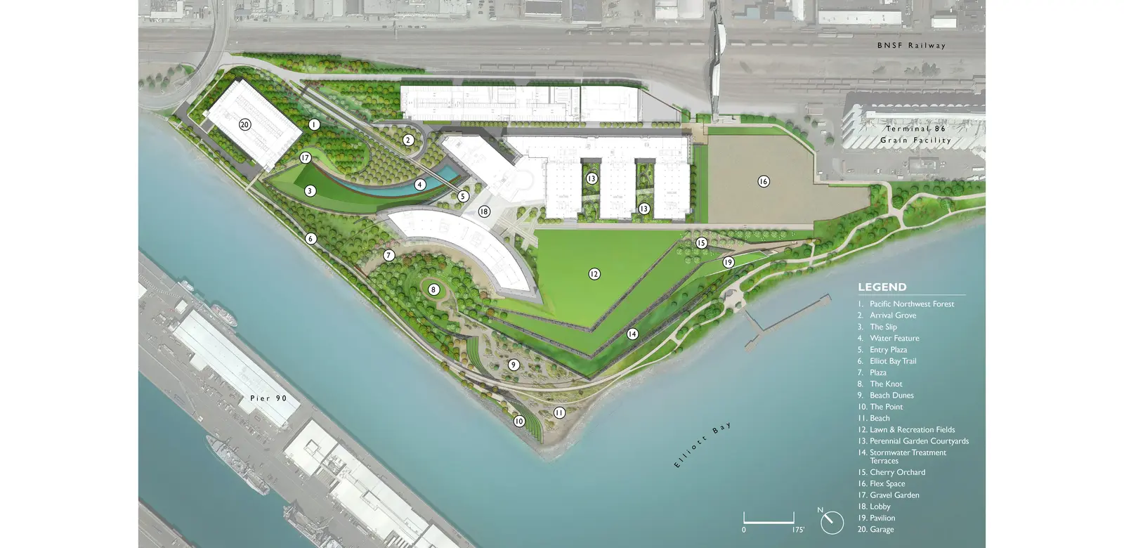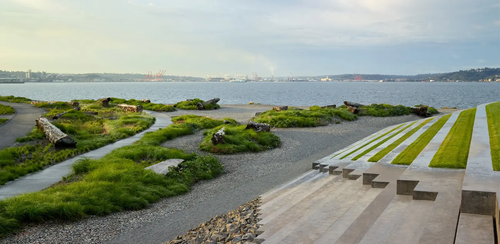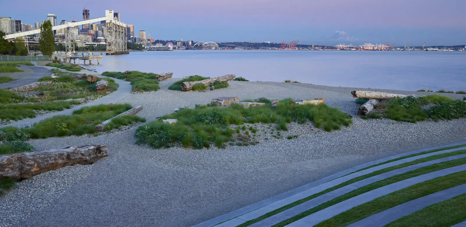 The Beach invites users to pause at the edge of Elliott Bay. Celebrating the land-water threshold with views of the larger regional landscape, reclaimed materials and vibrant native plantings highlight the sculpted topography of the site. The expansive site is a place to celebrate and reinforce a sense of place while defining a new landscape approach centered on stewardship.