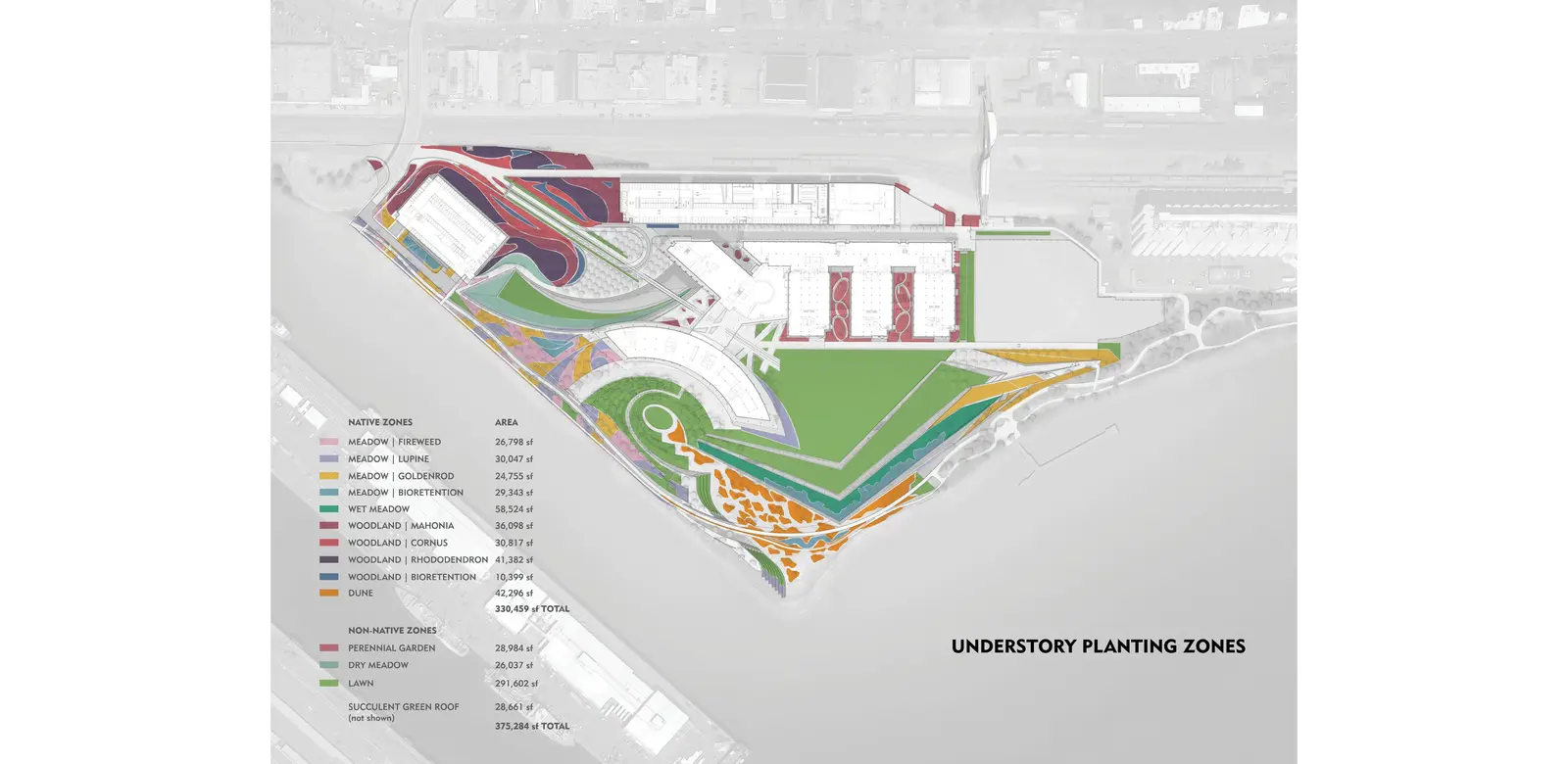 Soil management was a critical focus for the design, contributing to the success of the landscape and underscoring the long-term maintenance plan for the project focused on cultivating a low-maintenance and low-input landscape. A comprehensive assessment of the mostly paved, disturbed site was conducted at project onset. Harvested soil, tested for ecological benefits and long-term landscape health, was used to inoculate compost and base loam for the eight custom blends that correlated with the site’s planting communities. Soil scientists tested and monitored the soil after installation, informing the formulation of compost tea blends used to seasonally inoculate the soil and plants, stimulating biological activity and resilience without chemical fertilizers.