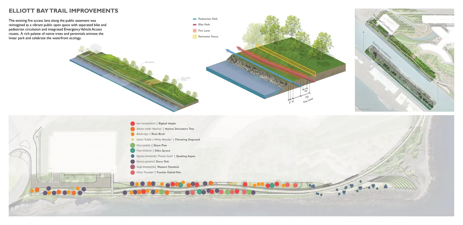 The designers collaborated with the client to re-aggregate public easements, creating a consolidated park and trail system along the Puget Sound for the public. A new terraced overlook and a richly planted dune habitat softens the edge of the water and provides new universally accessible space at the edge of Elliott Bay. A separated system of bike and pedestrian paths weave through the landscape that is rich with native plants and trees, allowing habitat for pollinators and birds, and aligning with the Salmon Safe certification program requirements.