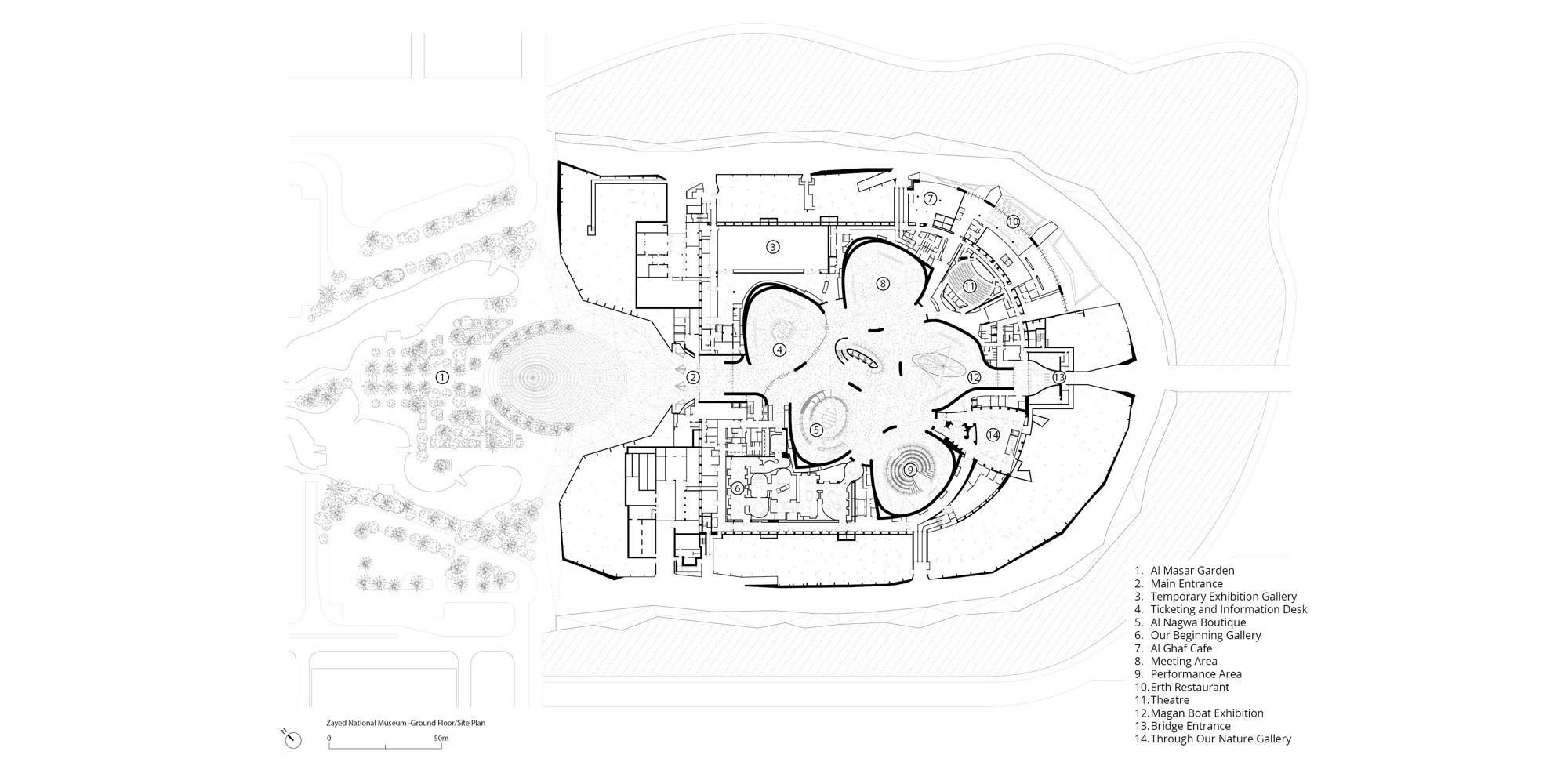 Text description provided by the architects. Zayed National Museum, the national museum of the United Arab Emirates, is located at the heart of the Saadiyat Cultural District in Abu Dhabi. The museum and its landscaped Al Masar Garden showcase the history, culture and, more recently, the social and economic transformation of the Emirates. The building’s form addresses the challenge of sustaining life in a desert environment and the strong cultural traditions of the UAE.