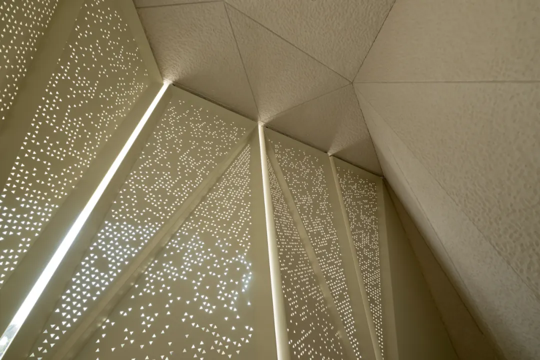 The museum spaces are located within a mound, which has textured faceted panels that are an abstraction of the UAE’s topography. The mound insulates the interior spaces from solar gain, forming a protective shield that prevents heat from entering the building. When visitors step inside the museum, they enter the light-filled atrium, or Al Liwan, which serves as both a meeting and orientation space, hosting performances such as traditional dance and poetry.