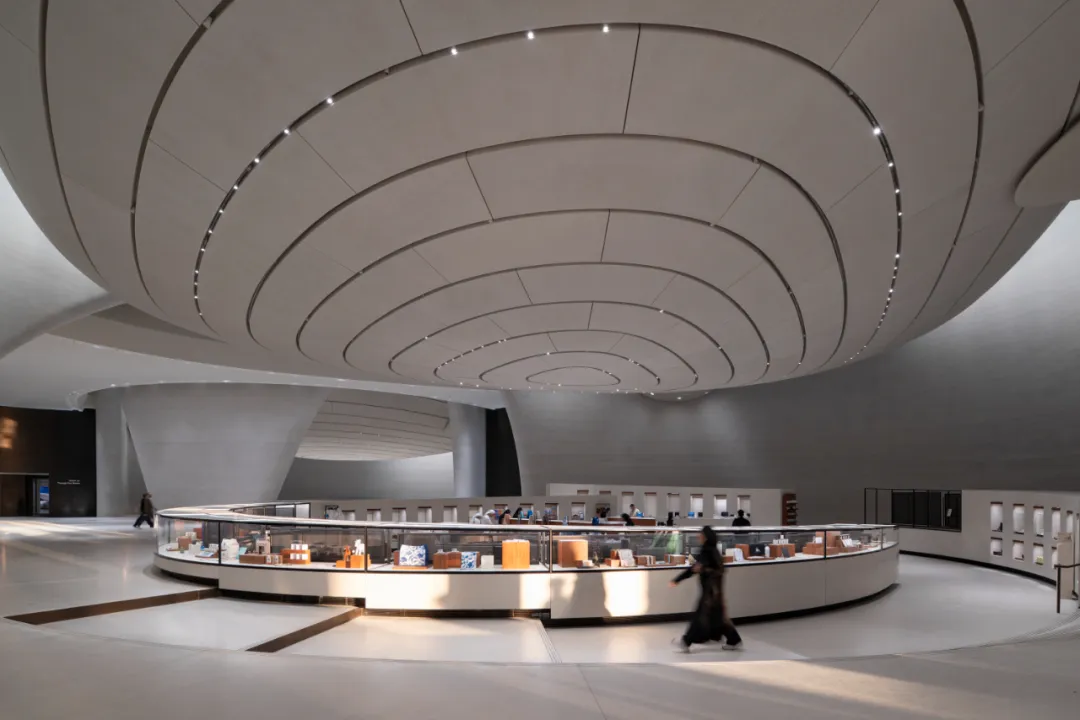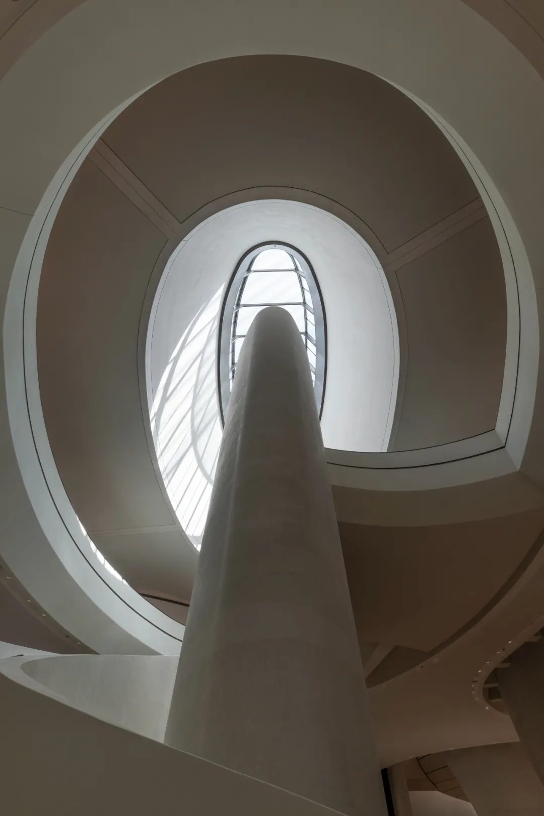Each of the pod-shaped galleries is curated to reflect a specific theme, while the connecting nodal spaces provide contextual information that tie them together. Visitors can choose their own route through the different galleries and make their way to the upper level via a sculptural spiral staircase or lifts. At ground level, there are also two more permanent gallery spaces that are near to the museum’s entrances, as well as a temporary exhibition space, a fine dining restaurant, and a cafe.